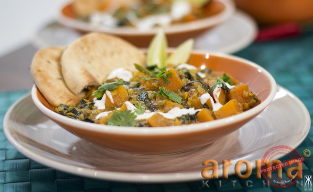 Start this recipe by heating the oil in a large pan and fry the onion and garlic for 3 minutes. Add in the diced sweet potatoes and cook for a further 3 minutes. Stir in the Madras curry paste and cook for a minute to release all its flavours. Pour in the coconut mix, add in the soaked lentils and season well with salt. Turn down the heat to a simmer and continue to cook the curry for 15-20 minutes by which time the curry will be thick and creamy (You may need to add in a little water if the curry becomes a little dry). Finally, add in the spinach leaves and chopped coriander and allow to cook for another minute. To serve, spoon the curry into bowl, spoon over a little butter and serve with warmed naan bread.