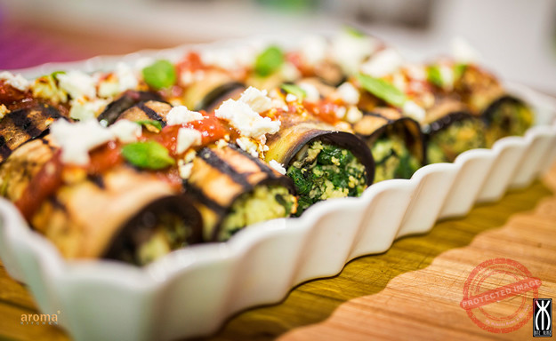 Involtini tal-brunġiel mimlija bli-ispinaċi, faqqiegħ u ġobon feta