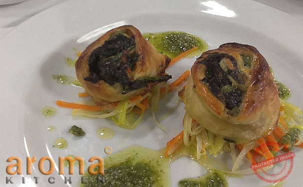 Shallow fry the onions garlic and spinach in butter, cook until soft, add nutmeg and pea puree. Meanwhile cut squares the puff pastry and spread the mixture, roll from left to right and cut in round slices to form whirls bake for 10 minutes at 180`c.