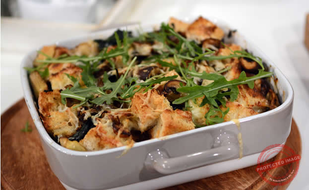 Start this recipe by heating together the milk, cheese and mixed herbs until the cheese has melted. Heat the oil and butter in a large pan and sauté the onion and garlic for a few minutes then add in the mushrooms. Cook for 2 minutes to remove any water before adding in the spinach and wilt. Add in the quartered artichoke hearts and season well with pepper and salt. Place half of the bread cubes in a greased oven proof dish and pour over half of the cheese sauce. Spoon over half of the spinach mixture and repeat the process again with the bread, cheese sauce and the remaining spinach mixture. Grate over a little move of the Chevrette goats cheese and allow to sit for 5 minutes for the bread to soak up all the juices. Bake at 200`c for 25 minutes or until the top is golden brown.