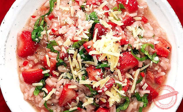 Pour the stock into a pan and bring to a boil, then reduce the heat and simmer. Meanwhile, melt the butter and olive oil in another pan. Add the garlic, onion thyme and cook over low heat, stirring occasionally, for 5 minutes, or until it is softened. Add the rice and cook, stirring, until all the grains are coated with melted butter. Add the wine and cook to evaporate for 4 minutes. Add a ladleful of the hot stock to the rice and cook, stirring, until it has been absorbed. Continue adding the stock, a ladleful at a time, and stirring until each addition has been absorbed. This will take 18-20 minutes. Meanwhile, set a few whole strawberries aside for the garnish and mash the remainder in a bowl. Ten minutes before the end of the cooking time, add the mashed strawberries to the risotto. When it is almost ready, gently stir in the cream and Parmesan and season with salt and pepper. Serve garnished with the reserved whole strawberries.