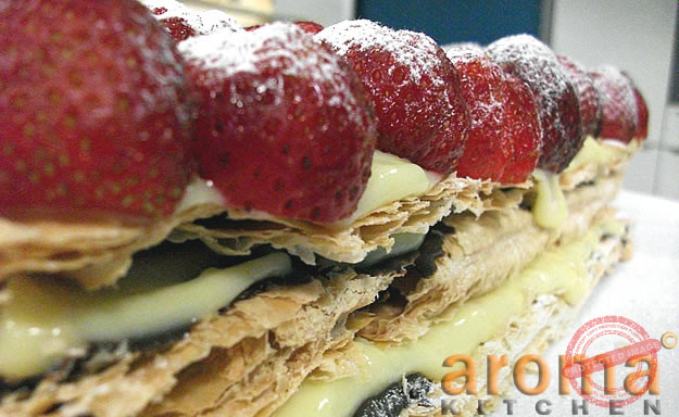 Start by making the pastry cream. Put the milk, lemon zest and vanilla in a pan and heat till almost boiling. Meanwhile, whisk the egg yolks and sugar together in a bowl for 2 minutes till light and pale in colour. Whisk in the corn flour and plain flour, and then whisk in the almost boiling milk, stirring constantly. Put this mixture back into the saucepan and bring to the boil whisking all the time. When the pastry cream has thickened, allow it to come to the boil and then remove it off the heat. Finally, stir in the butter. Pour the pastry cream into a dish, cover with cling film, and leave to cool down for an hour to set. Next, prepare the puff pastry by rolling out each piece very thin, to 30cm x 14cm in size. Place the 3 pieces of puff pastry onto greased baking trays and prick all over with a fork. Bake in the oven for about 45 minutes at 150`c, as at this temperature you will be drying out the pastry to make it crisper. Remove the cooked puff pastry from the oven and put aside to cool. When the cooked puff pastry is ready, brush 2 piece with the melted chocolate and leave till set for 10 minutes. When ready, take the first piece of puff pastry and place on a long serving dish. Spread 1/3 of the cold pastry cream on top, and place the other chocolate covered piece of puff pastry on top. Spread this with ½ the remaining cream and place the last piece of puff pastry on top. Spread on the remaining pastry cream and smooth on top with a palette knife. Finally, cover the top of the mille-feuille with the whole strawberries, side by side. Place in the fridge to chill for 30 minutes. To serve, dust the top of the mille-feuille with icing sugar. (Serves 12)