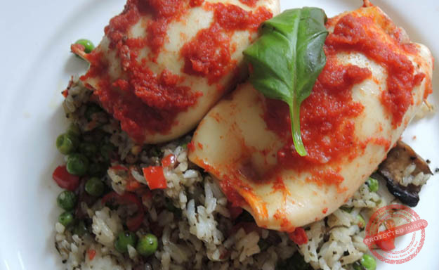 Stuffed calamari and seafood risotto