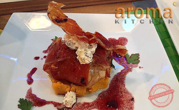 Chop the onion and fry lightly together with the chopped artichoke hearts, remove from heat and mix in the ricotta. Open the chicken flat and fill with the ricotta filling, roll again with 2 Parma ham slices on the outside. Place on a tray and cook for 20 minutes at 180`c. Place the other 2 pieces of Parma ham on the tray and roast until crispy to decorate. Over cook the sweet potatoes and mash them up with butter herbs and seasoning. Cook the chopped garlic in some butter without browning and then toss in the spinach. In a well -heated pan fry 2 cloves garlic add the port than the stock and reduce.