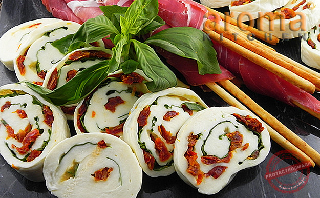 This recipe is extremely easy and you can use any filling that you wish. Start by laying out the mozzarella sheets on cling film. Spread one piece of mozzarella with the cream cheese and cover with a layer of fresh basil leaves. Cover with a layer of grilled pepper slices and roll up tightly using the cling film. Remove the cling film and slice into pieces, sticking a tooth pick in each piece to hold them together. Use the remaining ingredients to fill the remaining mozzarella sheet. Serve as tasty nibbles.