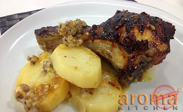 Remove the skin off the pork and make a pocket towards the bone. Mix the Maltese sausage, grated gbejna and the candied peel and stuff the pork with the mixture. Slice the nectarines and place them with the mixture, use toothpicks to secure. Mix the mustard with the oil and sage, pass the pork through and seal on high heat. In an oven proof dish slice the potatoes, add the stock, fennel seeds and the sealed pork. Cook in a hot oven for 1hour, basting occasionally, than uncover for the last 15 minutes.