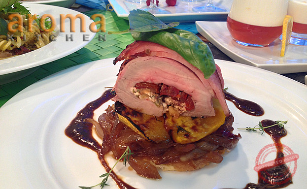Stuffed Pork fillet with feta cheese and walnuts on a caramelized onion tart