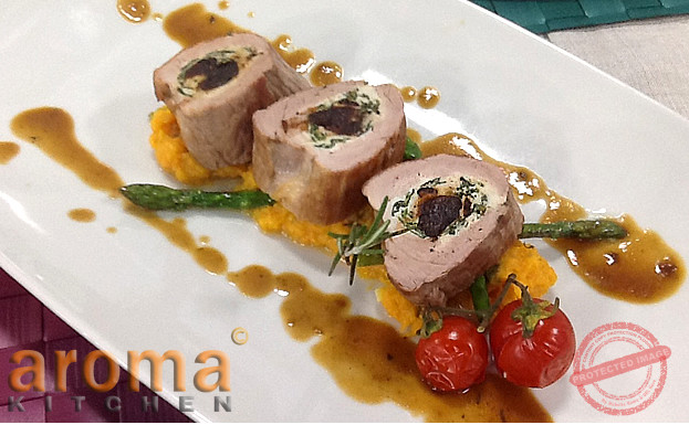 Stuffed pork fillet with prune and spinach served on honey and thyme sweet potato mash