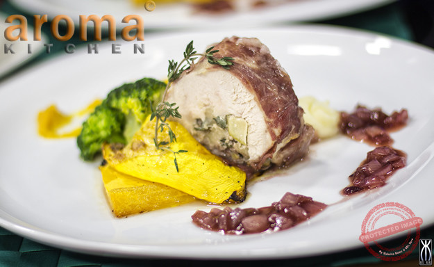 Dice half the onion and saute in butter, add the chopped apples toss than mix well with rabbit mince and sage. Open the turkey breast flat, place the filling in the middle wrap in prosciutto than in silver foil tightly. Using a well preheated pan and some oil fry the turkey wrapped in foil than finish in oven at 180`c for approximately 60 minutes Chop the onions and fry in some butter add the cranberry sauce and allow to caramelize, pour in the red wine simmer for 1 minute and then the stock, continue simmering until sauce is thick enough. Meanwhile, dice the potatoes in cubes and boil until soft, mash then add the butter, cream and seasoning. Slice the pumpkin, roast and blache the broccoli in boiling water and serve with the Turkey.