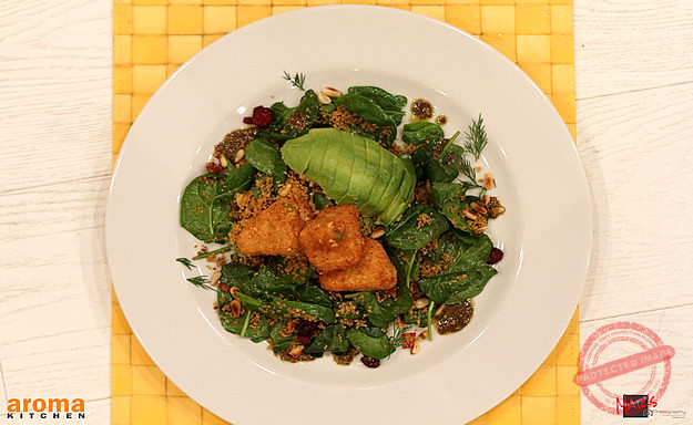 Make up the couscous by adding in enough hot water, along with the dried cranberries. Cover and allow to sit for 5 minutes. Meanwhile, cut the brie into 6 wedges and flour, egg and bread them. Fry then in hot oil till golden brown then allow to sit on kitchen paper to drain. Mix the warm couscous with the baby spinach and avocado. Make the dressing by mixing together all the ingredients and pour over the salad. Mix together well and serve in 2 deep plates with the breaded Brie on top. Toss over the pine nuts and serve immediately.