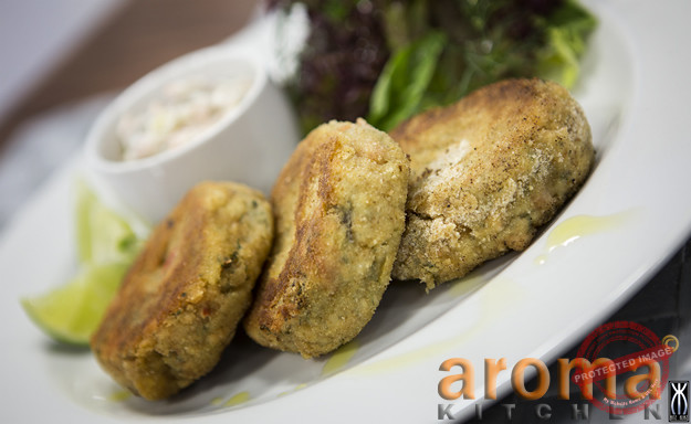 To make the fish cakes, boil potatoes until soft; mash, but not too finely. Let cool. Cut shrimp into medium dice and sauté in melted butter along with the onion, red pepper and garlic, until the shrimp is just cooked, about 3 minutes. Add lemon juice, parsley, thyme and Cajun seasoning, and stir to combine. Drain in colander and let cool. Chop lobster; drain and stir into cooled shrimp mixture. Steam or poach haddock fillets. Flake haddock and combine with potato, shrimp and lobster mixtures. Cool then form into patties. For the coating, beat the eggs and whisk in milk. Dip patties in flour, shaking off excess flour. Dip into egg mixture until well coated, then dip into bread crumbs. Shallow fry the fish cakes in olive oil for about 3 minutes, until browned and crispy. Drain on paper towels. Make the mayonnaise by mixing all the ingredients together. Serve the fish cakes with a dollop of smoked salmon mayonnaise.