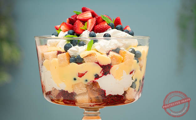 Start this recipe by making the jam. Place the defrosted raspberries and caster sugar into a small pan with a little lemon zest and 3 tbsp. water. Bring to the boil and cook for 5 minutes. Allow to cool down completely. Meanwhile, whip the 2 tubs double cream with 2 tbsp. icing sugar and vanilla to soft peaks. Put half into the fridge to decorate. Next, mix the mascarpone in a large bowl with the remaining 2 tbsp. icing sugar and lemon zest. Carefully fold in half of the whipped cream. Now you can put the trifle together. Place half of the cake into the base of a large trifle bowl. Spoon over half of the raspberry jam, followed by half of the mascarpone cream. Spoon over ⅓ of the berries, followed by half of the pouring custard. Repeat the process again using the remaining cake, mascarpone cream, jam, pouring custard and another ⅓ of the berries. To finish off, spread over half of the reserved whipped cream and pipe the remaining cream on top. Decorate with the remaining strawberries and blueberries and chill before serving.