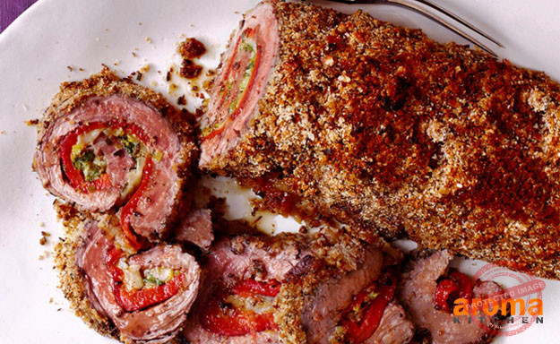 Sun-dried tomato and cranberry stuffed sirloin with a rosemary crust