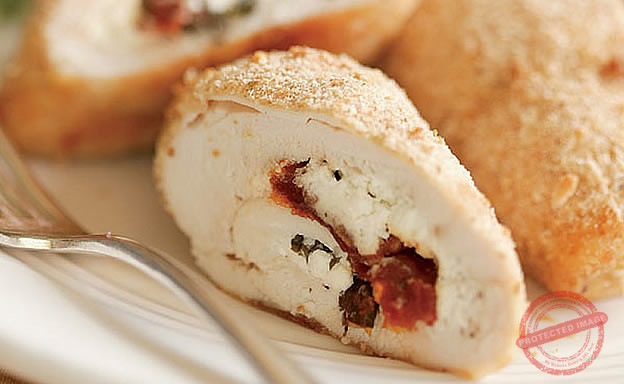 Sun-dried tomato and Parmesan stuffed chicken breasts with red pepper and chorizo beans