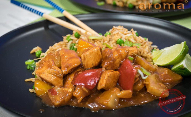 To make the sauce, drain the pineapple in a sieve over a bowl and keep all the juice (you should have about 150ml) Put the corn flour in a large bowl and stir in three tablespoons of the pineapple juice to make a smooth paste. Add the remaining juice and 150ml water, then stir in the soy sauce, vinegar, sugar, ketchup and chilli flakes until thoroughly combined. Set aside. For the rice, beat together the egg and sesame oil and put to one side. Heat the vegetable oil in a wok or large frying pan. When it’s shimmering and almost smoking, add the rice and stir-fry for about 3-4 minutes until completely heated through. Add the peas, spring onions and bean sprouts, if using. Stir-fry, turning the rice constantly around the pan, for about 3 minutes. Season well with soy sauce and pepper, then push to one side of the pan. Pour the beaten egg mixture into the other side and leave for about 10 seconds so it begins to set. Using a chopstick, briskly swirl around the egg to break it up and then toss around with the rice. Stir-fry for a further minute and serve straight away with the sweet and sour chicken.