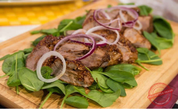 Start this recipe by placing all of the marinating ingredients into a saucepan and pour in a little cola. Bring to the boil and simmer for 5 minutes then remove off the heat. Allow to cool before bushing this mixture all over the pork fillet and allow to marinate for an hour. When ready to cook, heat griddle pan or you BBQ till hot, the seal the meat all over. Allow to cook, basting with the marinating sauce during cooking. To serve, allow the cooked pork fillet to sit for a few minutes before slicing up. Lay your fresh salad leaves onto a large serving plate or board and lay the pork fillet slices over decoratively. Top with some fresh coriander leaves and serve immediately.