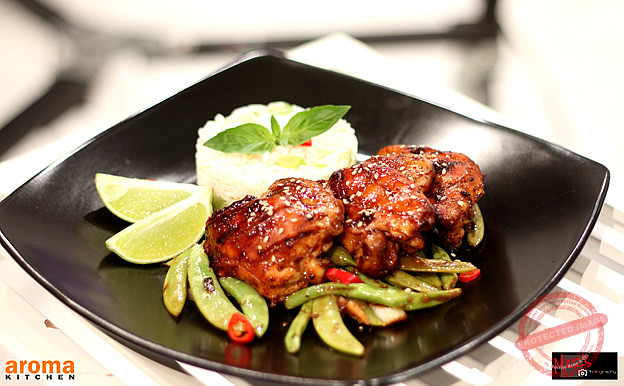 Sweet chilli marinated chicken thighs with jasmine rice and ginger string beans