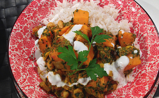 Start this recipe by heating the oil in a large pan and gently fry together the onion and garlic for 3 minutes. Add in the sweet potato and continue to cook for 2 minutes. Next, stir in the spices and ginger and cook for 1 minute before adding in the tomato polpa and 200ml hot water. Bring to the boil, turn down the heat and continue to cook for 15-20 minutes or until the sweet potato is cooked. Squeeze the water out of the leaf spinach and add the curry along with the chickpeas. Heat through for a few minutes then stir in the yogurt and chopped coriander. Serve immediately with the cooked basmati rice.