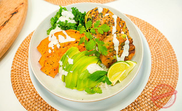 To make the sweet potato cake, blitz together all the ingredients except the oil and sesame seeds to a paste. Chill for 15 minutes then form into small patties and coat in the sesame seeds. Place onto a baking tray, drizzle with a little olive oil and bake for 10-12 minutes in the oven at 200°C. Meanwhile make the tahini dressing by mixing together all the ingredients. To put the buddha bowl together, spoon the cooked rice into one side of your deep bowls. Lay in the cooked pumpkin, kale and avocado slices. Place on the sweet potato cakes and decorate with the tahini dressing, lime wedges and extra herbs.