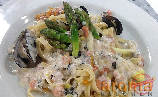 Pre heat pan and start by shallow frying the onions and garlic till soft. Pour in the white wine and reduce by half before adding in the fish stock. Reduce by half again. In a separate pan cook the peeled shrimps in some olive oil until cooked. Squeeze over the lemon juice, add in the mussels and cook until opened up. , Mix all the ingredients in one pan and serve with the cooked pasta whilst still hot.