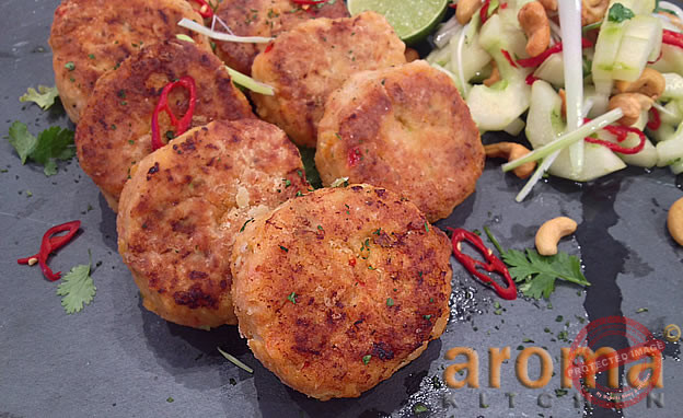 Thai fish cakes with cucumber and peanut salad
