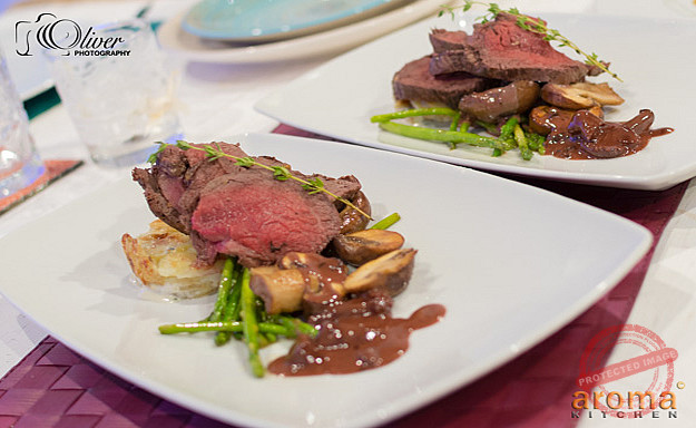 Thyme infused Chateaubriand on a blue cheese potato cake, oyster mushrooms and French beans