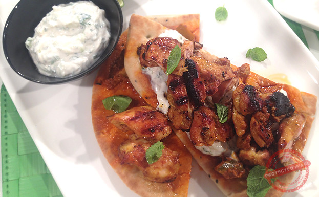 Toasted naan bread with sweet grilled chicken, lime pickle and raita