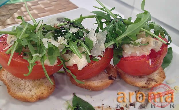 Toasted tomato salad with melting gorgonzola, rocket leaves and pine nuts