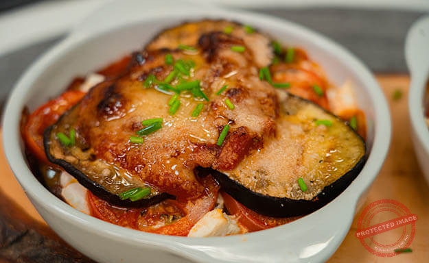 Layer the vegetables like a lasagna, starting with the tomato sauce, aubergines, mixed goat cheese, mint leaves and tomato than repeat again.