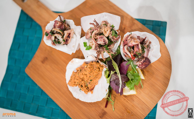 In a food processor blend well all the dip ingredients, season and add more olive oil is you prefer a softer dip consistency. Slice one of the calamari, toss in the corn flour, season, deep fry for few seconds than put on a paper towel to absolve extra oil. Squeeze the lemon on, sprinkle the parsley and serve. Slice another calamari and saute in olive oil with the chopped garlic and chilli for a minute, finally add the thyme, toss and serve. Slice the last calamari and sauté with the ginger and lime zest for 1 minute, than add the coriander and some lime juice to finish, season and serve.