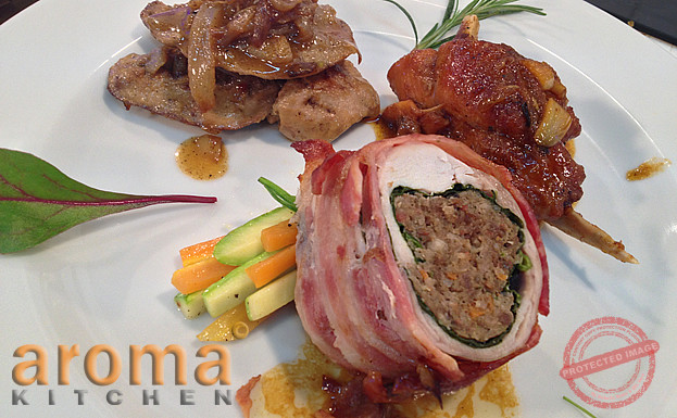 Start by opening up the rabbit loin, line up spinach and add the meat mixture into the centre of the loin. Roll up and roll up again in bacon rashes. Seal the loin on a pre heated pan and continue to cook in oven for 25-30 minutes at 180`c.