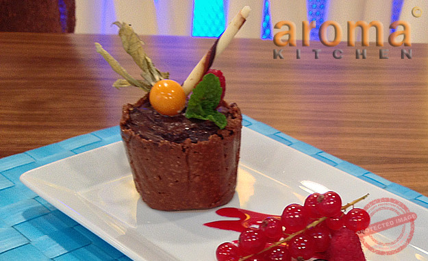 Start this recipe by making the truffle filling. In a saucepan, bring the cream just to simmer over low heat. Pour the cream over the chocolate in a bowl and let stand for about 10 minutes to melt the chocolate. Add the vanilla and stir until smooth. Set aside to cool for 1 hour. When ready, place the chocolate into a mixing bowl and beat at medium speed until the mixture thickens. Meanwhile, make the biscuit base. Use a fork to mix together the chocolate wafer crumbs and butter. Grease a 6-muffin baking tin and line the cups with strips of baking sheet, cut so that they are as wide as the diameter of each cup and long enough to hang over the sides. Use the bottom of a small glass to press the crumbs over the bottom and sides of the muffin cups, building the sides up to only about 1 ½ inches. Place a raspberry in the centre of each crust and with a pastry bag fill the truffle mixture. Smooth the tops and refrigerate until set, about 2 hours.