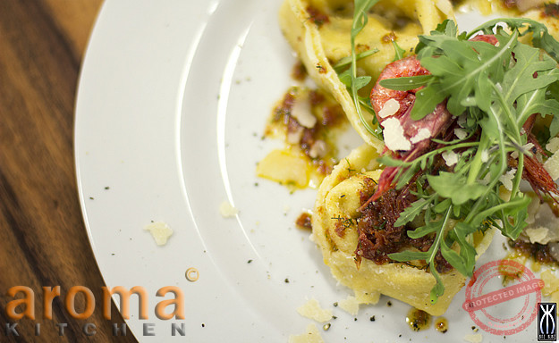 To make the dough, mix all the ingredients together until the dough is formed and allow to rest covered. Next, chop the onion and garlic and sauté in little olive oil until softened without browning. In a food processor blend the olives and mint leaves than add the cooked onions and garlic together with the raw tuna cut in cubes. Blend slowly to mix well without making the tuna a paste. Cut the opened dough in squares and put the filling in the middle and fold in the tortelloni. Blend well together the sundried tomatoes, olive oil and dill, boil the tortelloni and toss in the sundried tomato oil. Serve topped with parmesan shavings rocket leaves and fresh grinded pepper.
