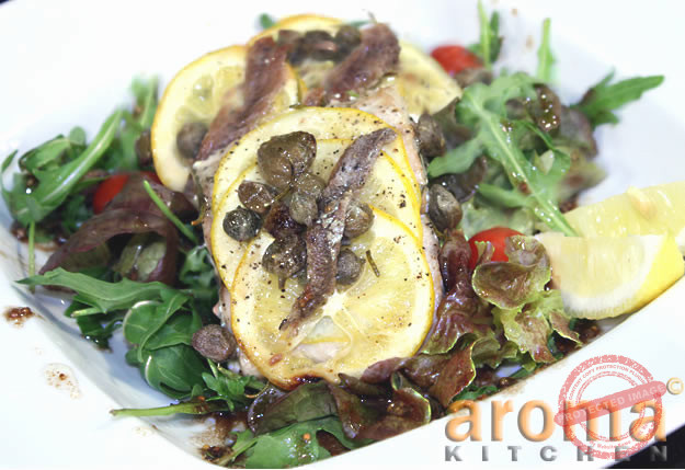 Tuna fish fillets with capers, ancovies and caramelized lemons