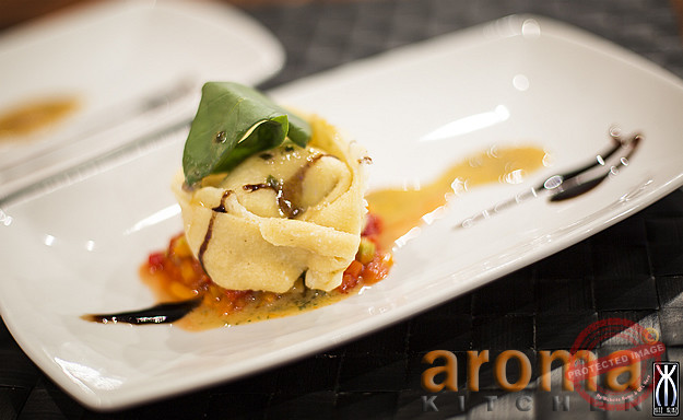 Tuna tortellacci on a caponata salsa and prawn infused cream