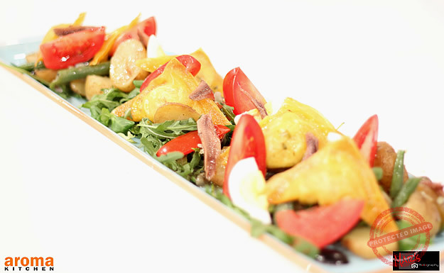 Drain the tuna from their oil, put in a mixing bowl together with the cream cheese, lemon, spring onions, garlic and parsley. Brush a baking tray with the olive oil. Take a wonton skin and place a teaspoon full of the tuna filling in the centre, moisten the edges and press tightly to secure filling. Place wontons on the oiled baking tray, brush with more olive oil and bake in a hot oven until crispy. In a separate mixing bowl, mix together the boiled potatoes, olives, beans and capers, dress with the olive oil and balsamic vinegar. Arrange the salad leaves in the bottom of a serving plate, top up with the potato mixture, decorate with the tomatoes, egg wedges and anchovy fillets. Serve with the tuna wontons over the salad.