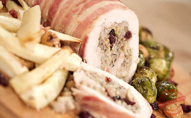 Start this recipe by frying the onion, garlic and herbs together for 5 minutes with a tablespoon of olive oil. Remove off the heat. In a medium sized bowl, mix together the pork mince and the Maltese sausage filling. Stir in cooked onion and garlic, cranberries, grated apple, chopped chestnuts and season with salt and pepper. Lay open the turkey breast and lay over the stuffing mixture. Roll up tightly and wrap over the bacon slices. Wrap up in foil and place onto a baking tray. Bake in the oven at 200`c for 30 minutes then remove the foil and continue to cook for 15-20 minutes. Remove from the oven and allow to rest for 5 minutes before cutting up and serving with roasted potatoes and vegetables.