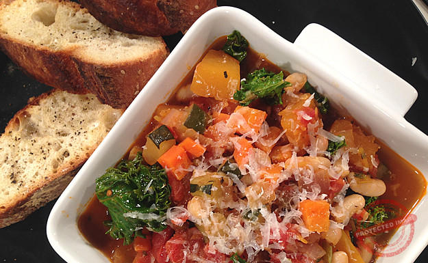 Heat the olive oil in a large pan and sauté the onions and garlic for 2 minutes. , Add in the carrots, celery, zucchini, pumpkin, chilli flakes and dried herbs and cook for 1 minute more. Stir in the tomatoes, sugar and stock and season well with salt and pepper. Bring to a boil, turn the heat down and add the chopped kale. Cover the pot and simmer for 15-20 minutes. When ready stir in the cannellini beans and heat through before using a stick blender to partially puree the soup. Stir in the fresh parsley. Serve the Tuscan soup into large soup plates topped with Parmesan and a side of crusty bread.