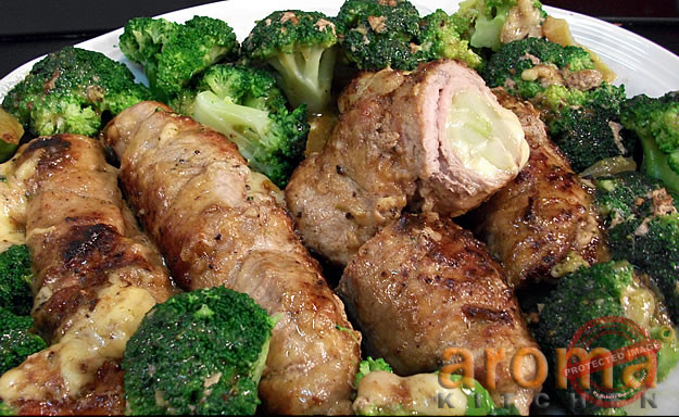 Aqta l-brokkli f’bukketti zghar individwali. Qaxxar iz-zkuk torja umbaghad qattahhom fi strippi rqaq. Sajjar il-fjuri tal-brokkli fliemkien maz-zkuk go borma bl-ilma bil-melh ghal 6 minuti biss umbaghad saffi. Poggi slajs Emmenthal fuq kull slajs vitella umbaghad qassam iz-zkuk tal-brokkli bejn is-slajsis tal-laham. Hawwar bil-melh u bzar umbaghad obrom il-vitella f’bragoli marsusin. Orbot il-bragoli sew bi spaga. Sahhan iz-zejt u l-butir f’tagen u aqli l-bragoli sakemm jiehdu kulur dehbi id-dawra kollha. Zid il-brodu vegetali u halli l-bragoli jsiru bil-mod ghal ftit minuti. Zid il-brokkli u kompli sajjar ghal ftit minuti ohra qabel isservi.
