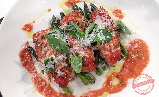 Start this recipe by preparing the stuffing by heating the oil in a pan and sauté the garlic and onion for a few minutes till soft. Add in the chopped spinach, season well with salt and pepper and cook for 1 minute. Pile the spinach mixture onto the 4 veal slices and lay over slices of Brie cheese. Roll up tightly, then roll each breast with 2 slices of Parma ham. Place the involtini onto a baking sheet, drizzle with a little oil and cook for 12-15 minutes or until cooked through. Meanwhile prepare the tomato sauce. Heat the oil in a small pan and sauté together the onion and garlic. Add in the chilli flakes, passata and sugar and season well with salt and pepper. Cook down for 10 minutes before adding in the cream and chopped basil leaves. Panfry the asparagus in a pan. To serve, spoon the creamy tomato sauce onto 2 serving plates and lay the cooked asparagus on top decoratively. Serve the involtini on top of the asparagus.