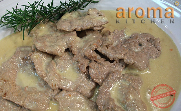 Poggi l-laham f’dixx u hawwar bil-bzar. Sadanittant sahhan iz-zejt u l-butir f’tagen gbir. Poggi l-fletti tal-laham fliemkien ma’ftit klin u sajjar il-laham sakemm jasal biex isir fuq iz-zewg nahhat. Aqleb il-laham darba biss. Nehhi l-laham mit-tagen, poggih f’dixx u zommu shun. Zid lis-stock pots mal-meraq fit-tagen u hawwad fuq nar moderat sakemm jinhallu sew. Gholli ftit in-nar, zid ix-sherry u kompli sajjar ghal madwar minuta. Nizzel minn fuq in-nar, berred ftit umbaghad zid il-krema. Hawwad sew, zid il-laham u poggi t-tagen lura fuq in-nar. Sahhan il-laham sew fliemkien mal-meraq imma thallix it-tahlita tiftah tghali. Servi minnufih.