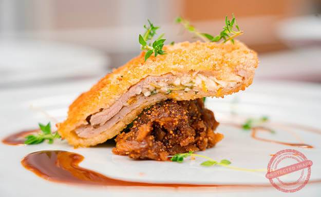 In a blender blend the butter than add the zest, rosemary and season well. Mix the butter with the cheese and place on the veal, roll well and put in the freezer for 1hr. Once hard enough cut thick slices and put it back for another hour in the freezer. Whisk the eggs and flour and pass the veal in than in breadcrumbs and shallow fry. Simmer the figs in the syrup and serve underneath.