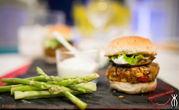Vegetarian bigilla burgers with grilled aubergine and Greek yogurt