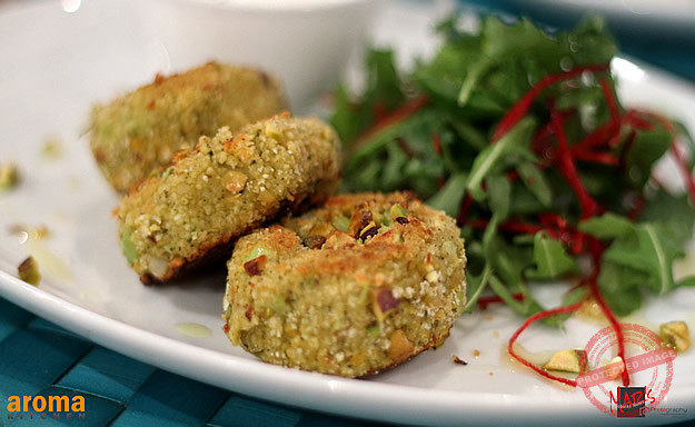 Vegetarian chickpea couscous cakes with pesto and pistachios