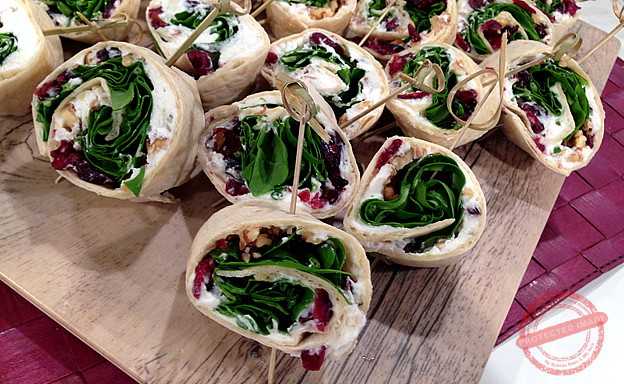 this recipe by placing the ricotta and cream cheese in a processor and blitz together for 20 seconds. Remove and mix in the cranberries and walnuts. Spread this mixture evenly over the wraps. Lay over a layer of fresh spinach leaves and wrap up tightly. Cut into slices and lay onto a serving plate.