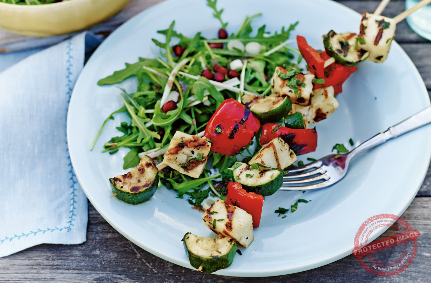 Vegetarian Halloumi skewers with minted Greek yogurt