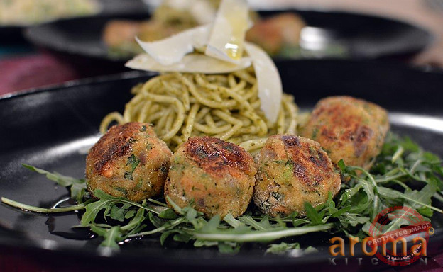 Start this recipe by cooking the red lentils in 2 cups water. Drain away any water once cooked and put to the side to cool down. Next, heat up a large pan with 1 tbsp oil. Sauté the onion and garlic together then add in the zucchini and continue to cook for 3 minutes. Stir in the grated carrot and cook for just 1 minute. Remove off the heat and stir in the fresh chopped herbs, cooked lentils, breadcrumbs and season well with pepper and salt. Stir in enough flour to bind the mixture together. Form into meatballs and fry in the remaining 2 tbsp of oil until golden brown all over. To serve, mix together the cooked spaghetti with the pesto and serve into a large dish. Toss over ½ rocket leaves then place over the cooked lentil patties. Sprinkle over the toasted pine nuts and decorate with Parmesan shavings.