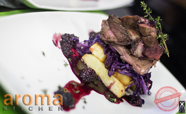 Shred the cabbage and cook in butter and honey until cabbage becomes bright in colour, add the red wine and raisins cover and allow to soften. In a well preheated saute pan seal from all sides the venison remove from pan, add butter and berries toss than add port and stock, simmer until thickened. Cut the potatoes in large strips mix with fresh thyme leaves, oil and roast until browned.