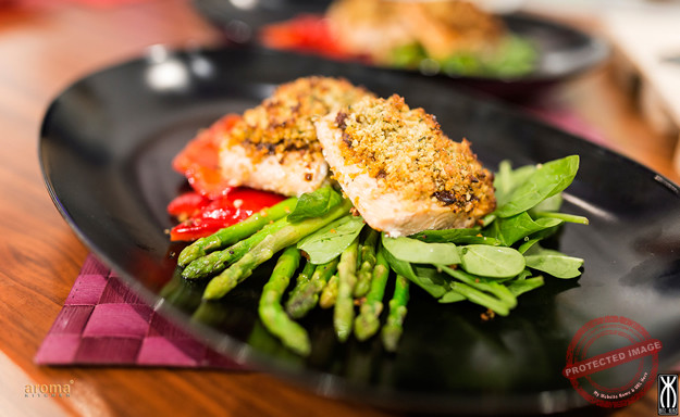 This is a very easy recipe to prepare. Season the defrosted salmon fillets with salt and pepper. Heat the remaining olive oil in a pan and quickly sear the salmon fillets on both sides for 2 minutes. Remove the seared salmon from the pan and place into a large oven proof dish. Spread over the sun-dried tomato paste. In the bowl of a food processor, blitz together the breadcrumbs and basil leaves. Stir in the chopped walnuts, butter and season with salt and pepper. Mix together well then press this mixture over the 4 seared salmon fillets. Bake in the oven at 200`c for 8-10 minutes. Meanwhile in another pan, heat together the oil, garlic clove and sprig thyme and cook for a minute or 2 to infuse. Add in the peppers, zucchini and asparagus and pan fry for a few minutes leaving firm. To serve, spoon the pan fried vegetables in the middle of 2 plates. Cover with a handful of fresh spinach leaves and arrange 2 crusted salmon fillets on top.