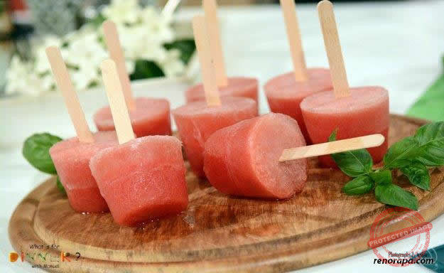 Start this recipe by preparing your watermelon puree. Skin the watermelon and blitz in a food processor. Pass through a fine sieve and discard the bits, to give you the pureed watermelon. Mix with the vodka, triple sec or syrup and lime juice. Toss in a few fresh basil leaves and pour into your lolly pop moulds. Place in your stick and freeze for 3 hours. Alternatively you can serve the mixture chilled poured into cocktail glasses.